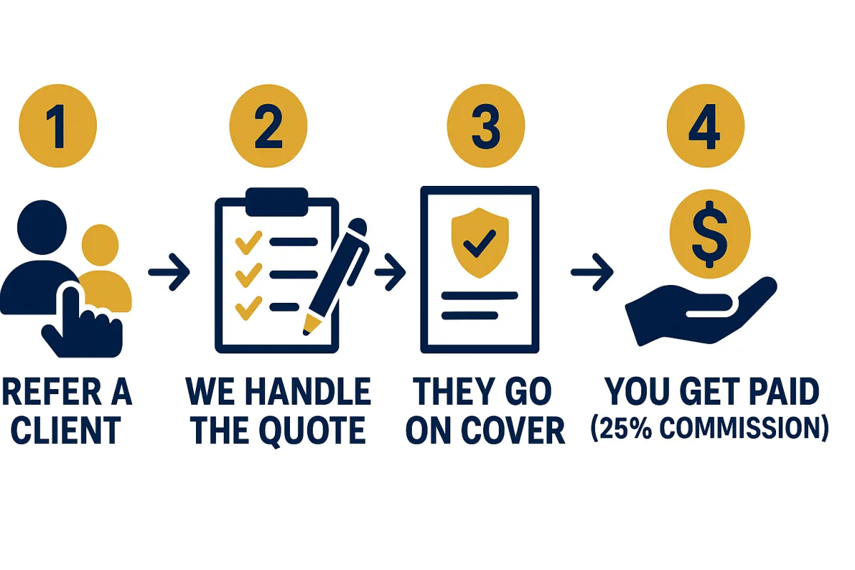 If you introduce a client to us and they choose to take out a policy, you earn 25% of the commission we receive. Simple, transparent, and paid promptly via BACS once the payment has cleared. .